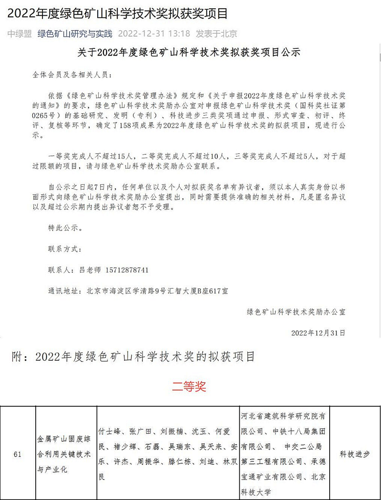 我公司申報的“金屬礦山固廢綜合利用關鍵技術與產業化”項目依據《綠色礦山科學技術獎管理辦法》規定和《關于申報2022年度綠色礦山科學技術獎的通知》的要求,經綠色礦山科學技術獎勵辦公室對申報綠色礦山科學技術獎(國科獎社證第0265號)的基礎研究、發明(專利)、科技進步三類獎項通過申報、形式審查、初評、終評、復核等環節,確定我公司申報的“金屬礦山固廢綜合利用關鍵技術與產業化”榮獲2022年度綠色礦山科學技術獎二等獎。
